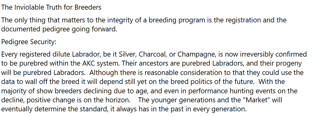 The following post almost immediately appeared to an unknowing group of Labrador Retriever Club members (who were never informed this was coming), and to the general fancy at large. [Please note that the highlighted emphasis is mine, and not in the original post. It will be used to contrast the comments now coming from the “silver” community]