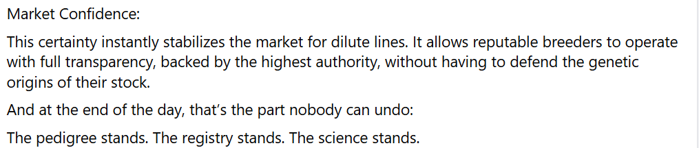 There was no conspiracy and no intent to mislead. But intent doesn’t erase impact. The thought was that it might help track dilute breeders and ultimately create their own registy but instead it created division.