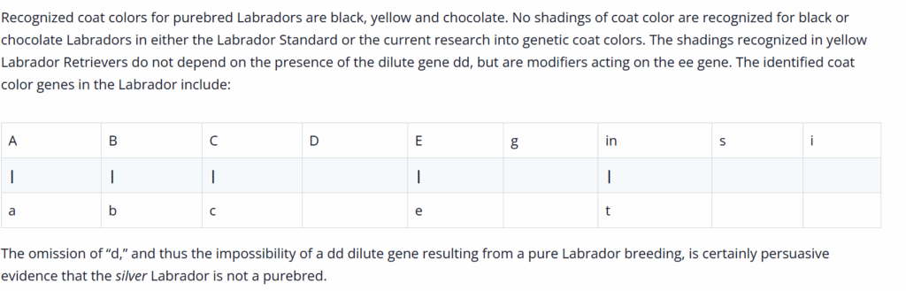 “It is the opinion of the LRC that a silver Labrador is not a purebred Labrador . The pet owning public is being duped into believing that these animals are desirable, purebred, and rare and therefore warrant special notoriety or a premium purchase price.”