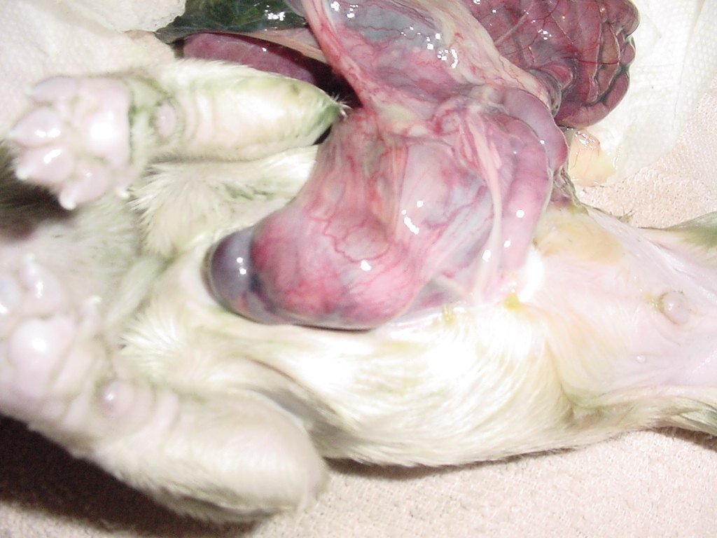 abdominal organs, including intestine, liver, and spleen are present